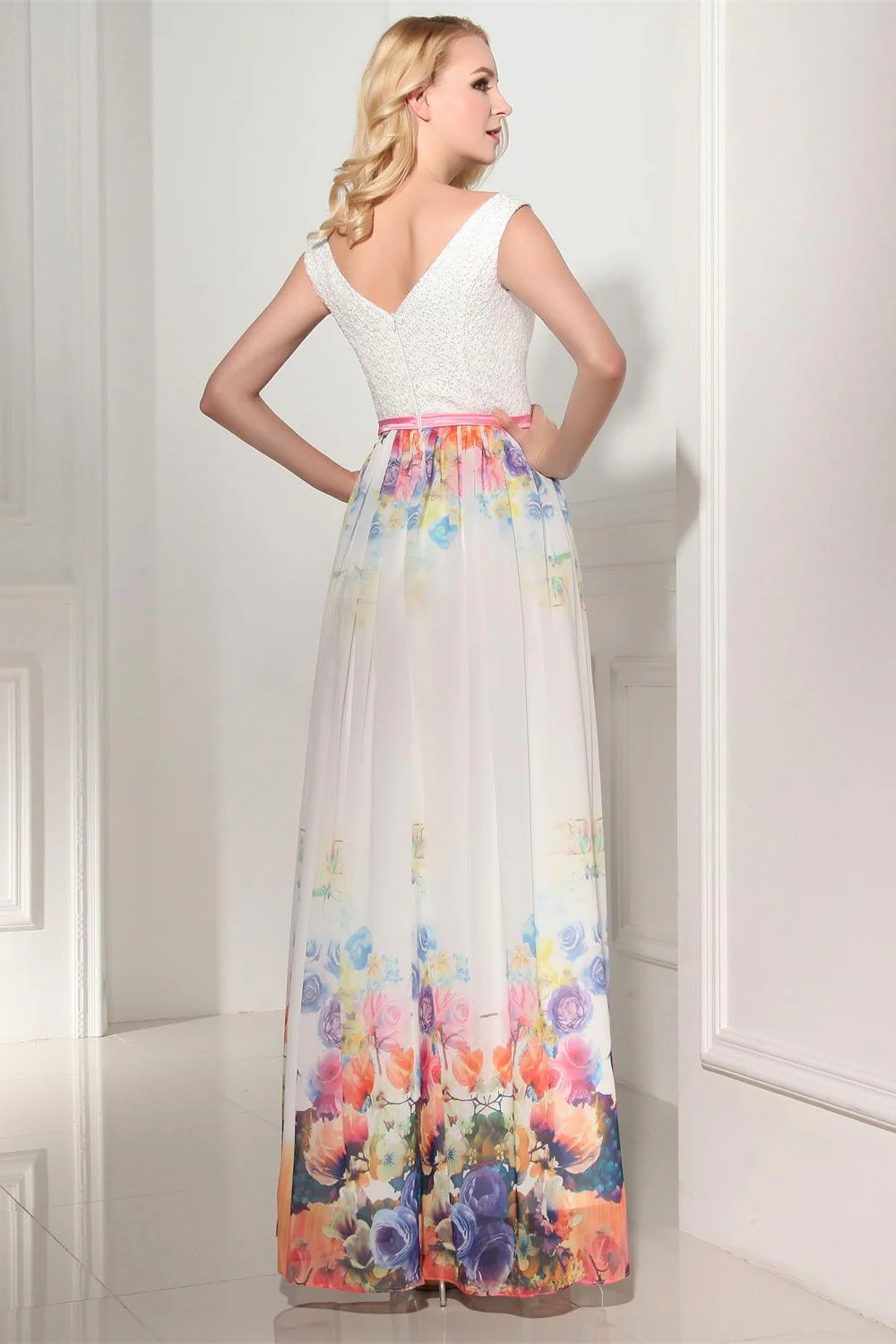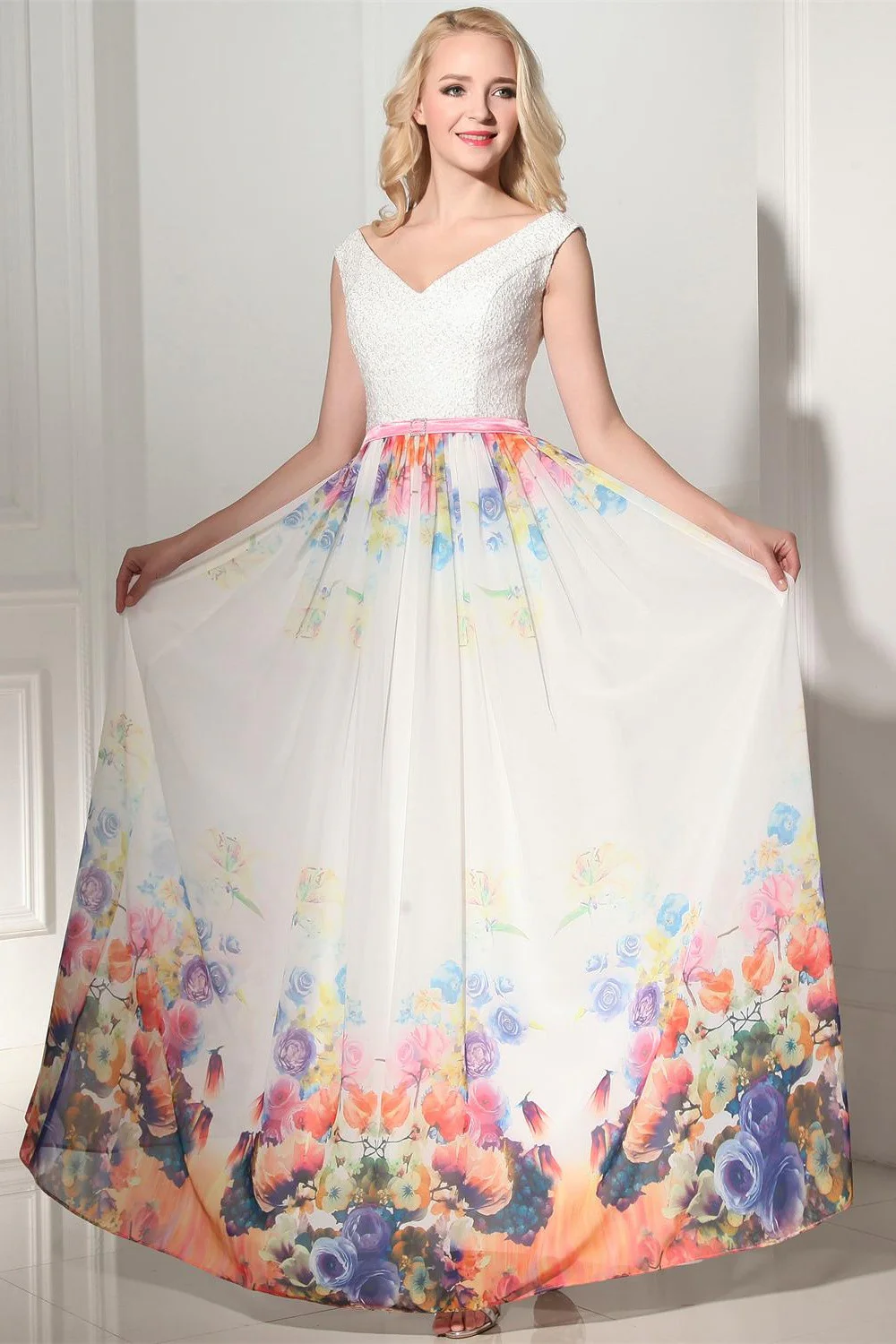Modest Simple Cheap Printed Long Chiffon V-neck Prom Dresses K121