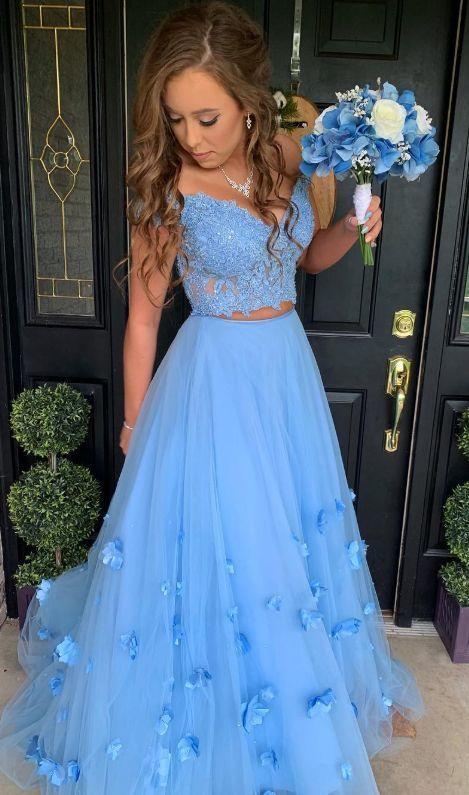 • 3D Flowers Blue Two Piece Graduation Gowns Off Shoulder A-line Long Prom Dress OKV72