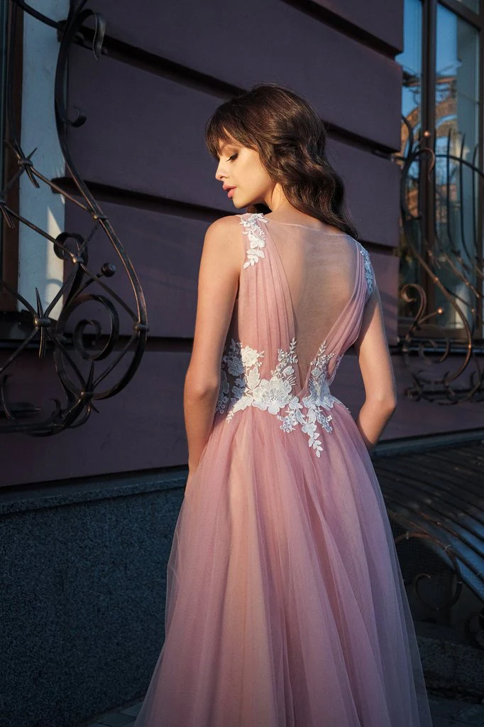 A-line Bateau Pink Tulle Long Prom Dress Applique Formal Gown OKR53