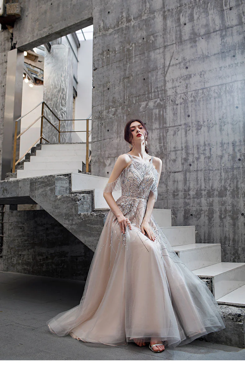 A-line Beaded Long Tulle Lace Up Back Prom Dress OKT25