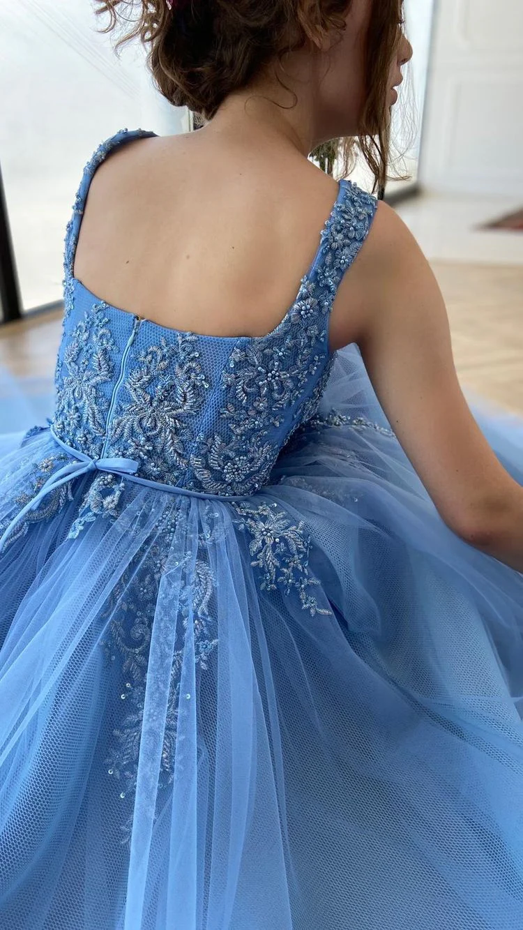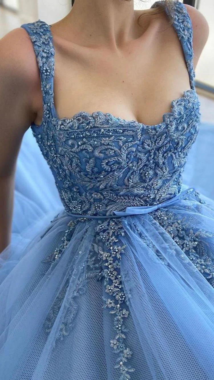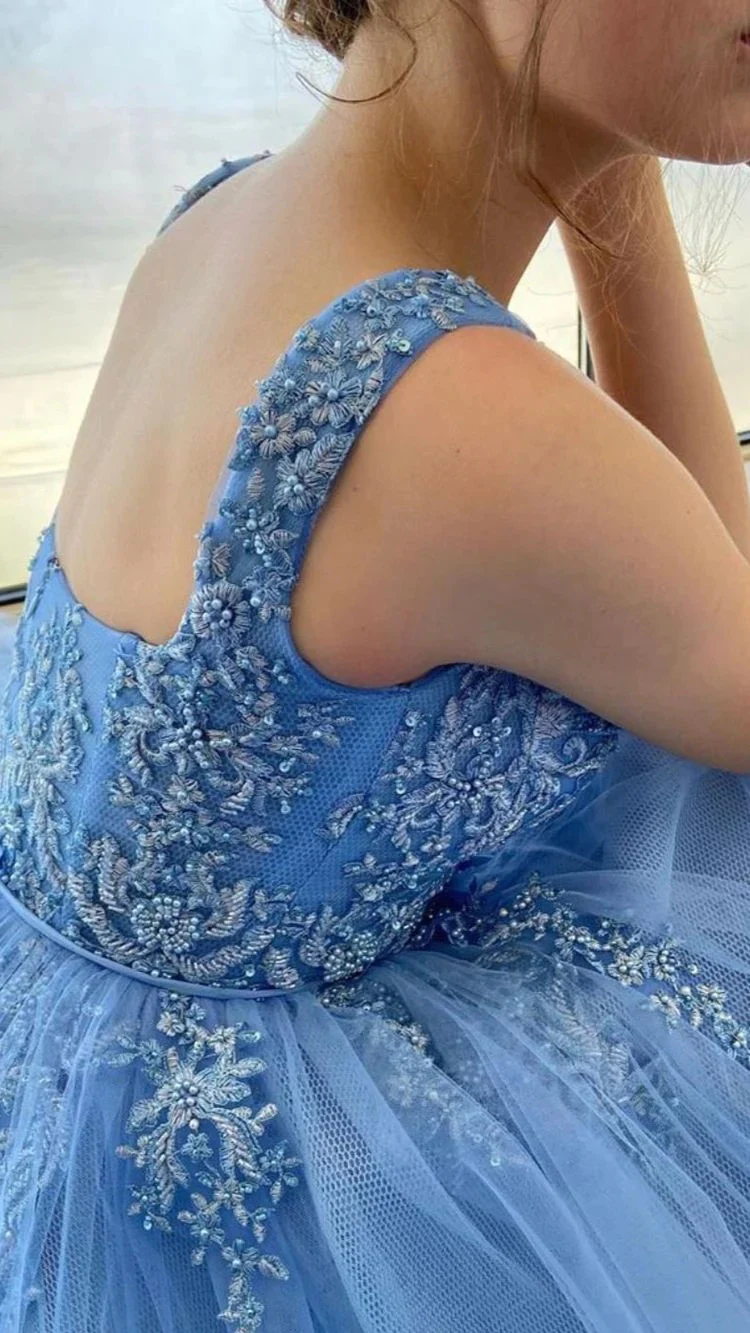 • A Line Blue Appliques Prom Dress Long Formal Evening Party Dress Celebrity Gown OK1633