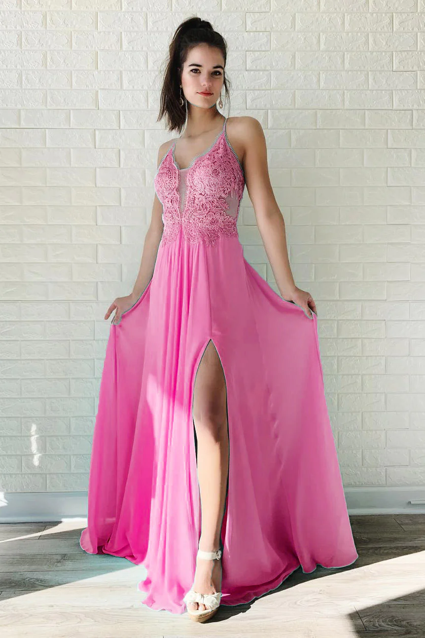 • A Line Chiffon Long Split Prom Dresses, Cheap Lace Up Back Evening Dresses OKJ52