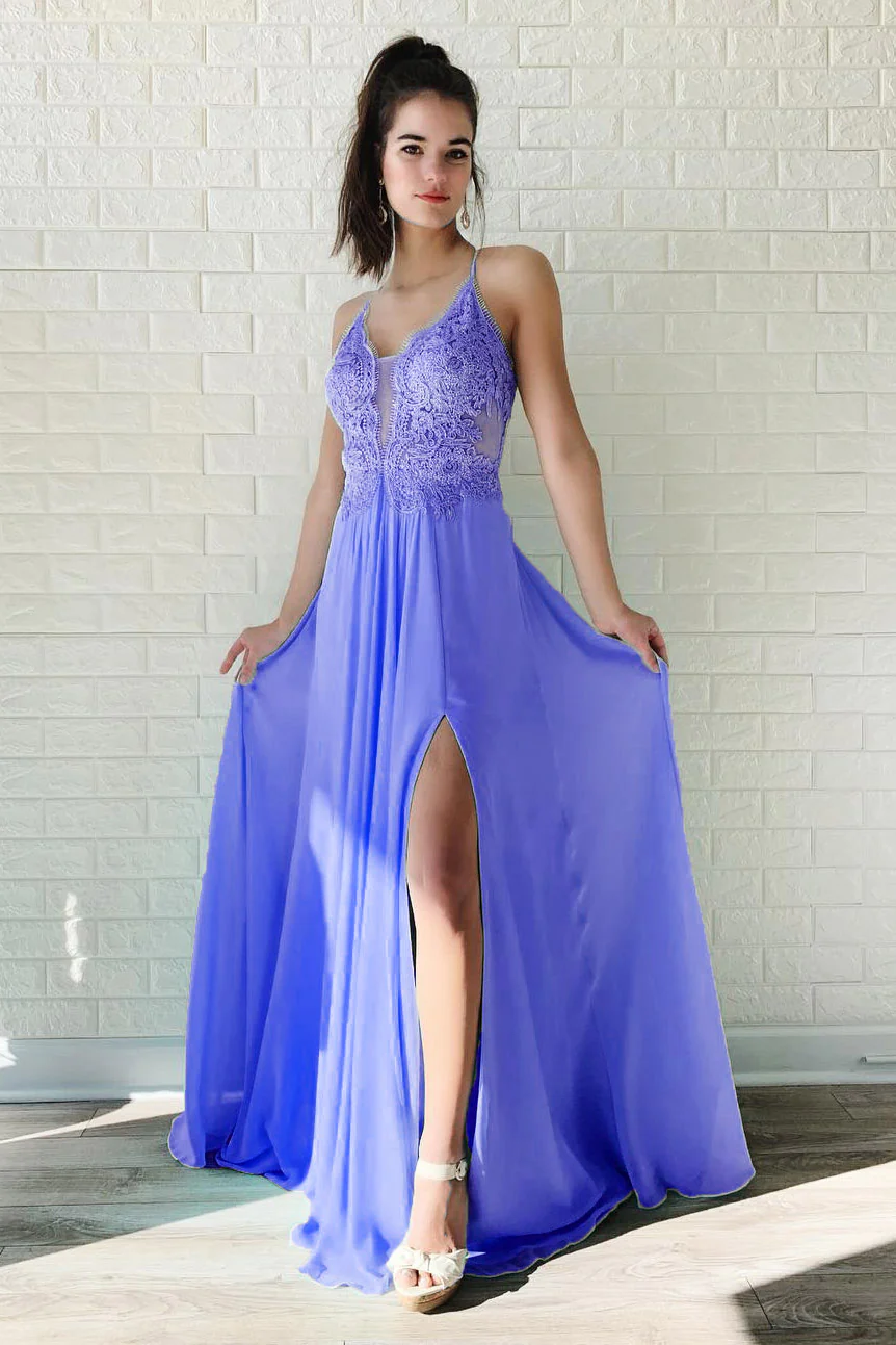 A Line Chiffon Long Split Prom Dresses, Cheap Lace Up Back Evening Dresses OKJ52