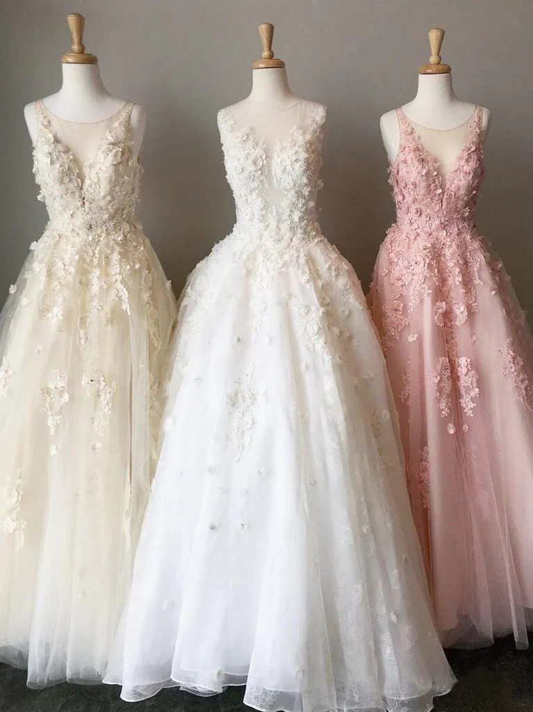 A Line Long Lace Applique Prom Dress Cheap Tulle Evening Dresses OKH43