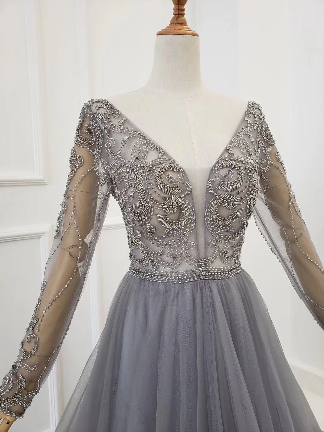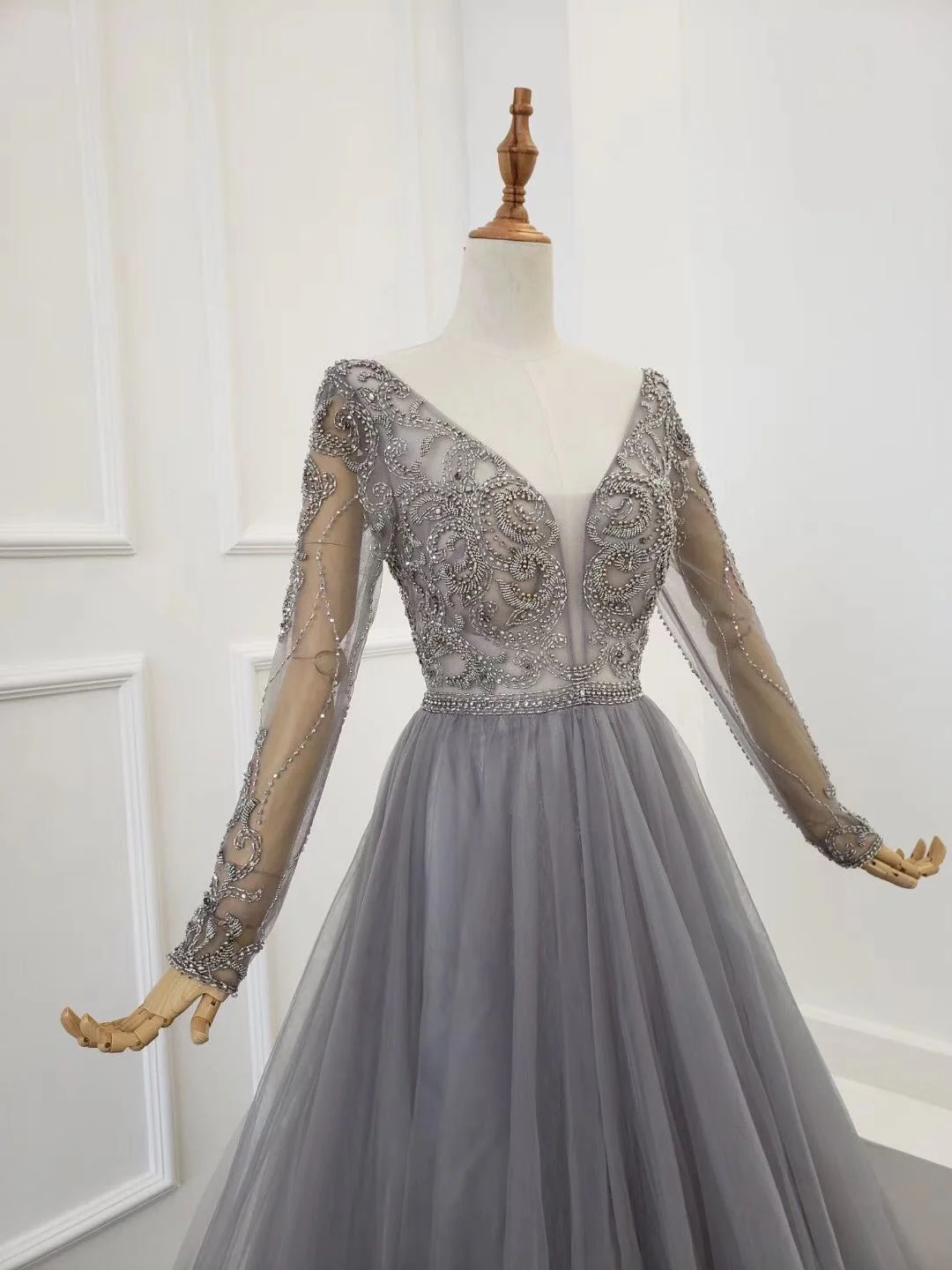 A-line Long Sleeves V Neck Grey Beading Prom Dress OKS91
