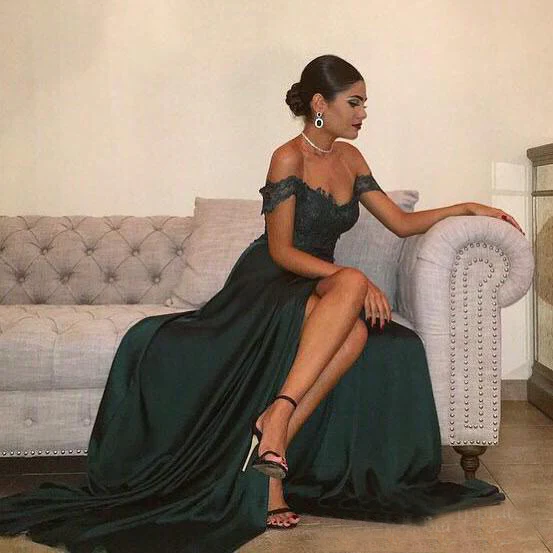 • A Line Dark Green Chiffon High Split Prom Dresses,Sexy Lace Top Party Gown OK842