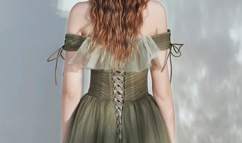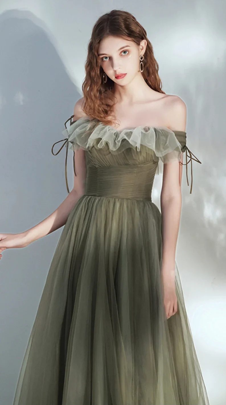 • A Line Off the Shoulder Tulle Floor Length Prom Dress Green Elegant Fairy Dress OK1390