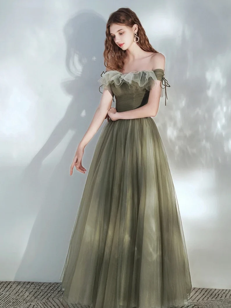 A Line Off the Shoulder Tulle Floor Length Prom Dress Green Elegant Fairy Dress OK1390