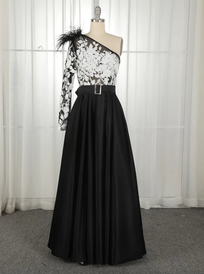 • A-Line One-Shoulder Black Long Lace Appliqued Split Prom Dresses with Pockets OKJ11