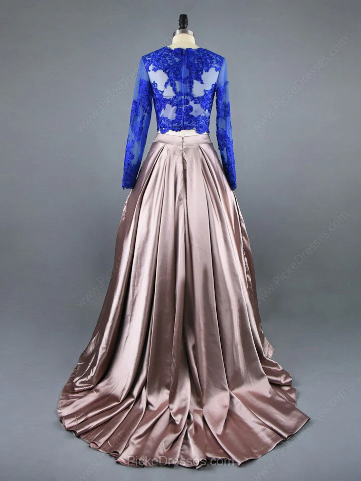 A Line Royal Blue Two Piece Long Sleeve Lace Top Prom Dress OK614