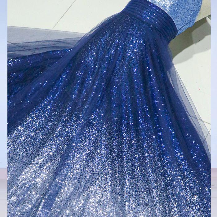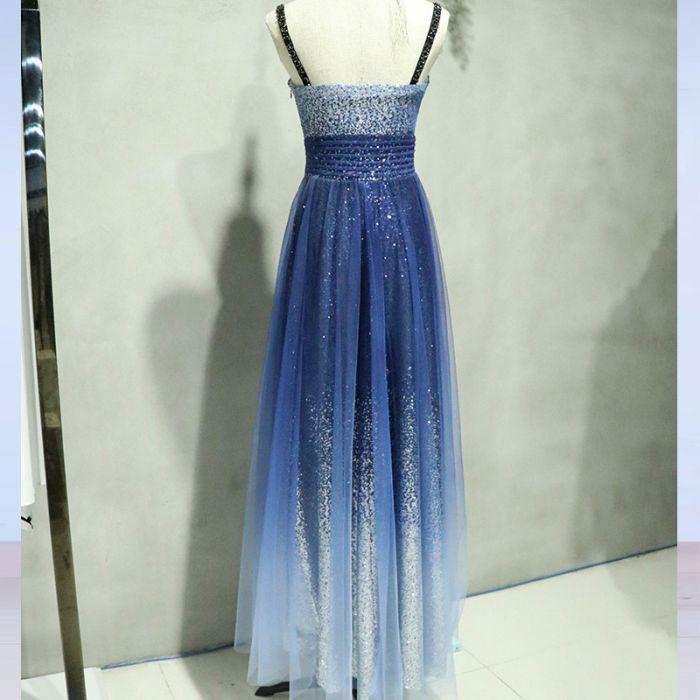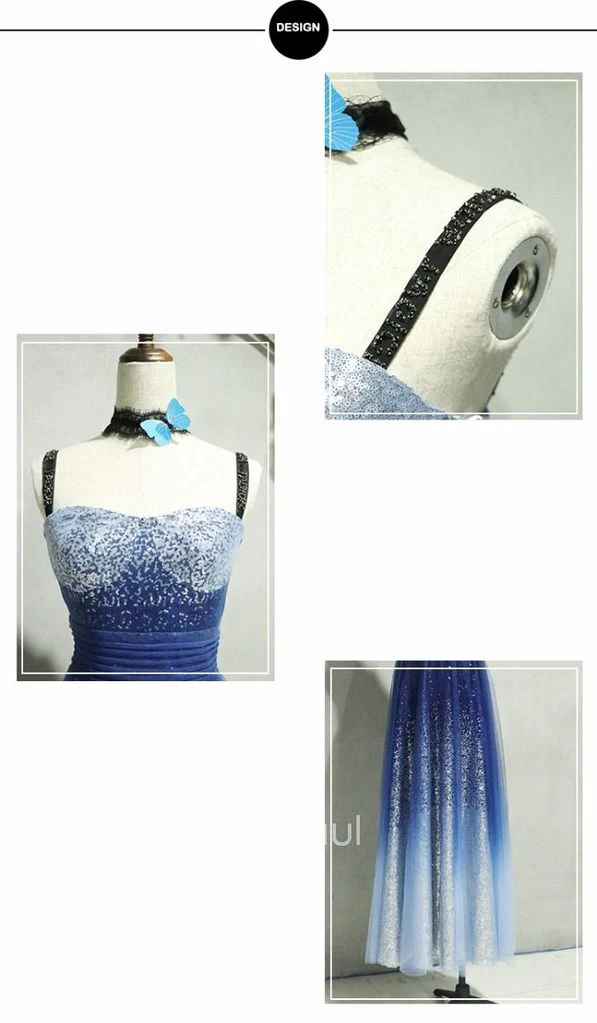 • A-line Spaghetti Strap Sleeveless Royal Blue Tulle Sequins Modest Long Prom Dresses OK616