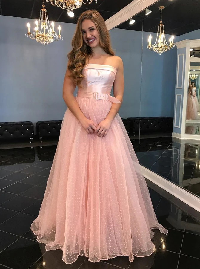 A-Line Strapless Floor-Length Pink Tulle Prom Dresses with Belt OKL67