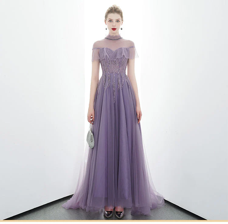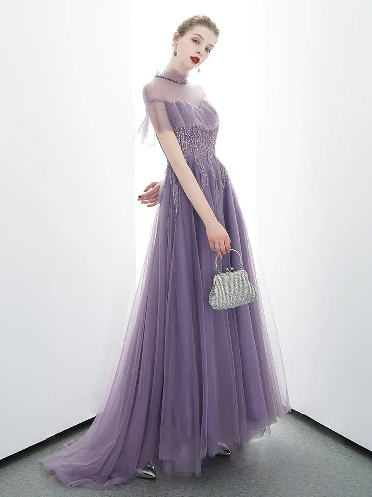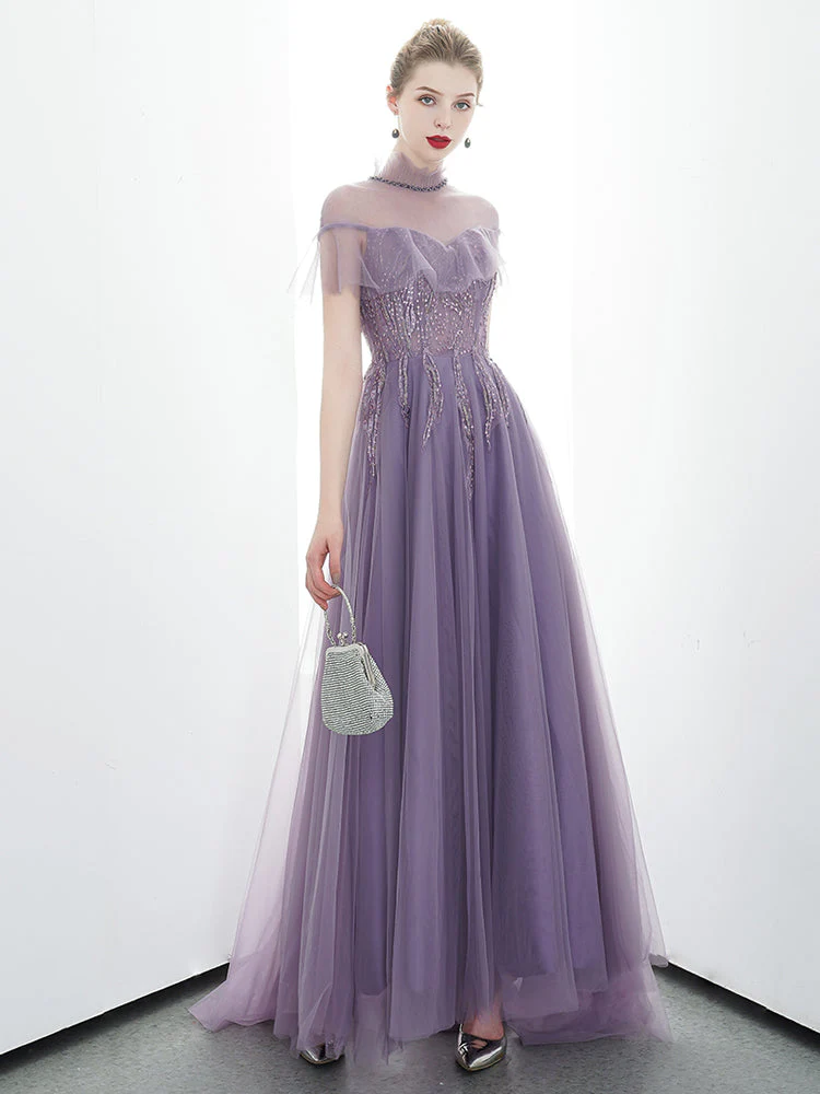 A-line Tulle Long High Neck Purple Prom Dress With Ruffles OKR86