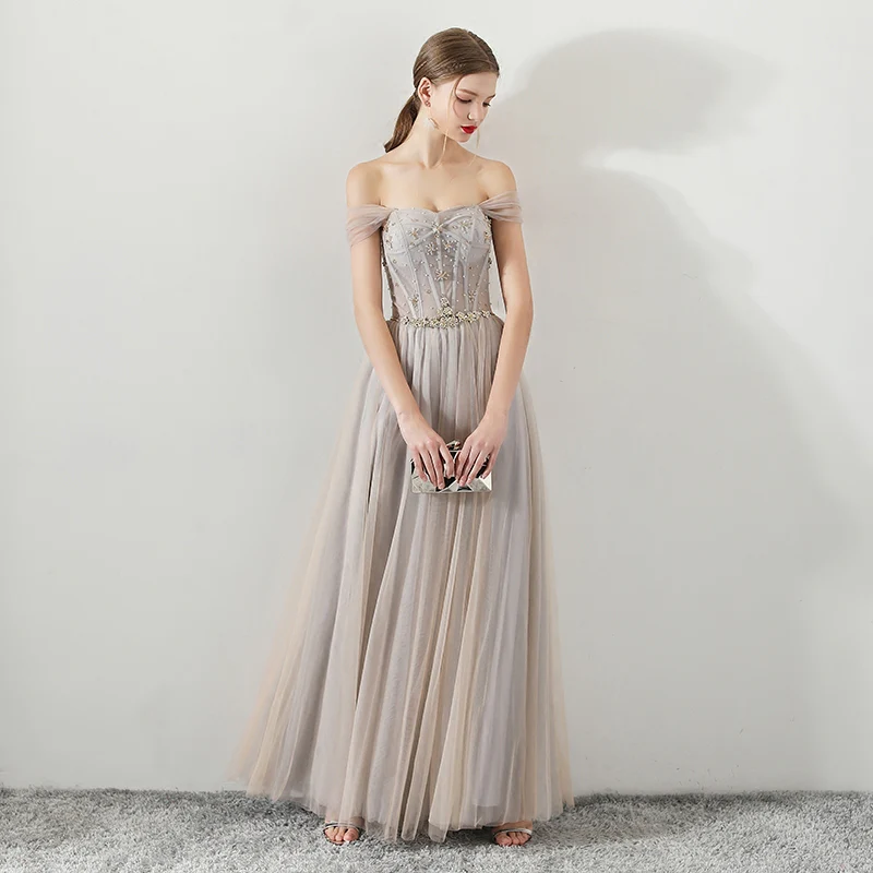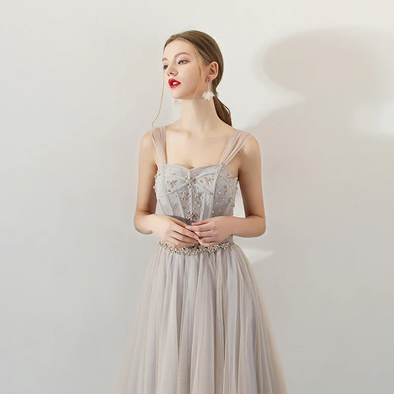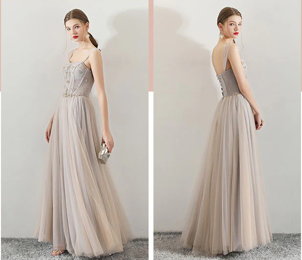 • A Line Tulle Long Straps Lace Up Back Beaded Prom Dress,Evening Dress OKG73