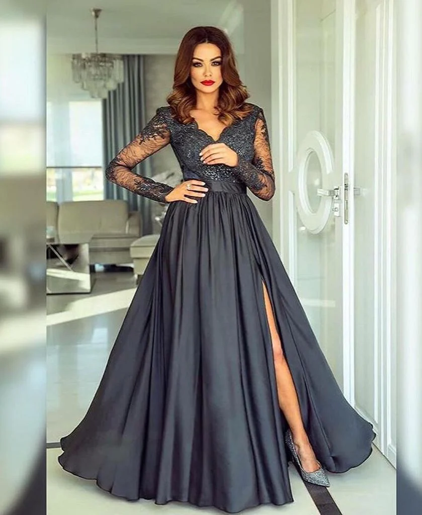 • A-line V-neck Long Sleeves Prom Dress Lace Appliques Formal Gown OKR73
