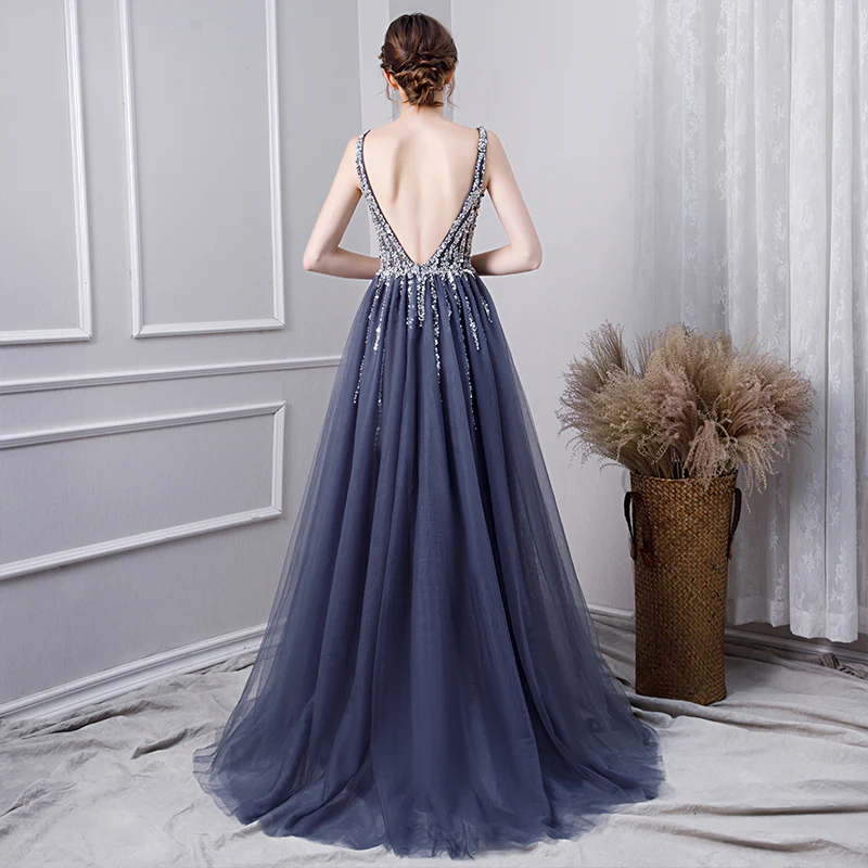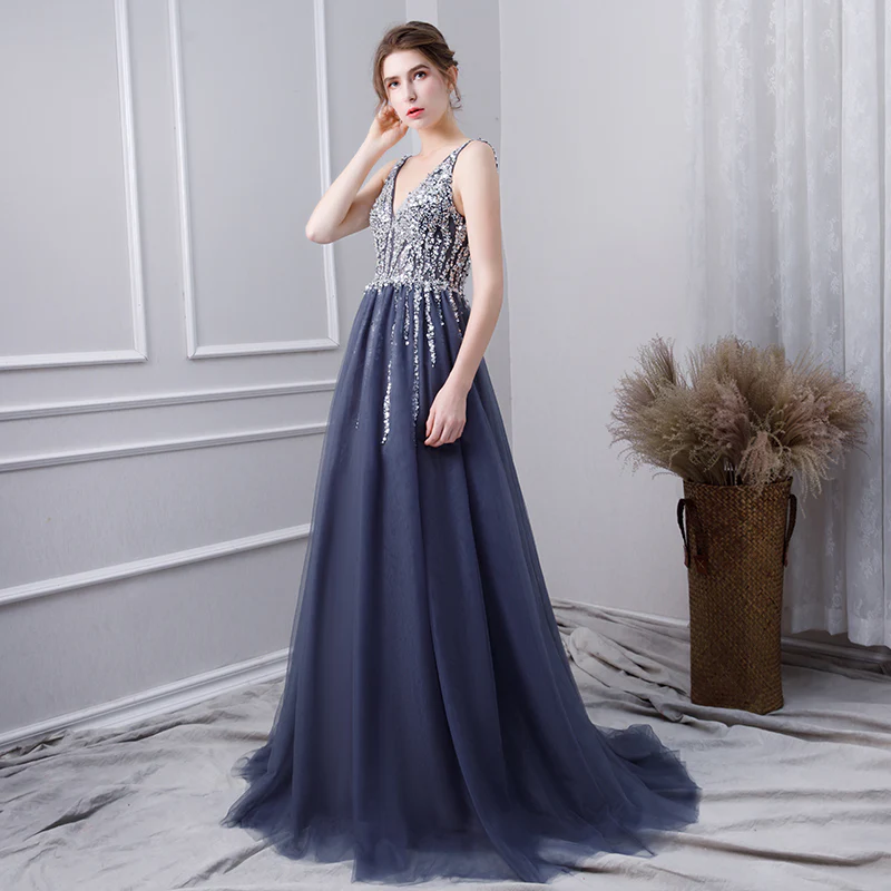 A Line V Neck Tulle Navy Blue Long Prom Dress With Beading OKL29
