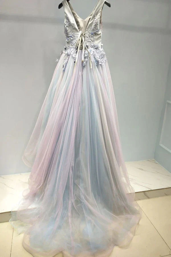 Appliques Long Prom Dress A-line V Neck Tulle Evening Dress OKU14