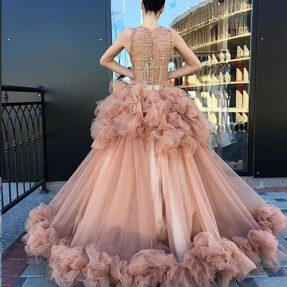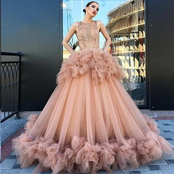 • Ball Gown Scoop Ruffles Tulle Long Beautiful Beading Prom Dresses,Quinceanera Dresses OKG26
