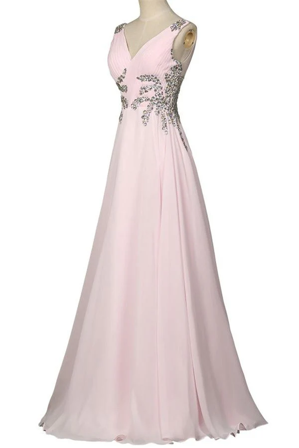 • Beautiful Girly Chiffon Long Beading Pink V-neck Backless Prom Dress K744
