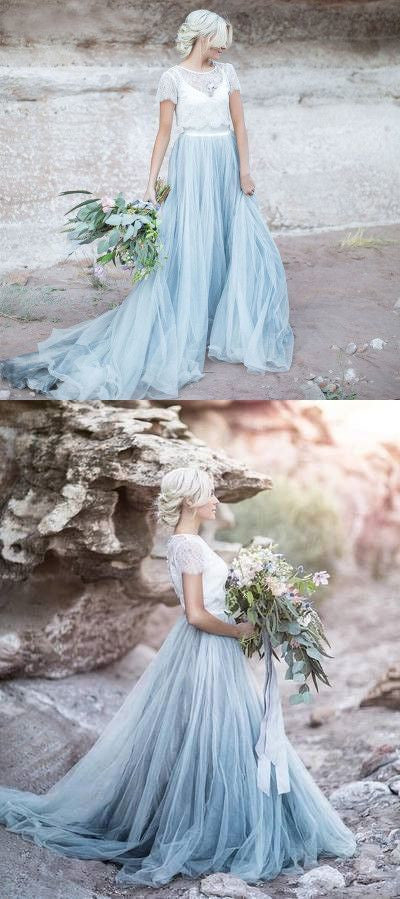 • Beautiful lace Top Short Sleeves Prom Dress, A Line Cheap Wedding Dress OKG4