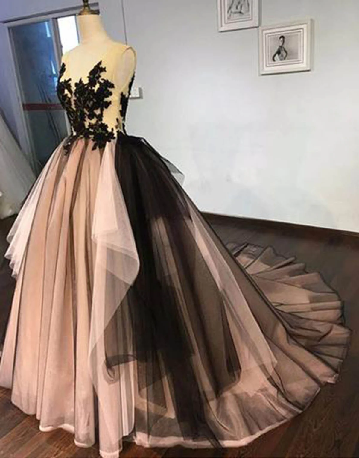 • Black Lace V Neck A-line Formal Prom Dress, Long Ball Gown Evening Dress OKG34