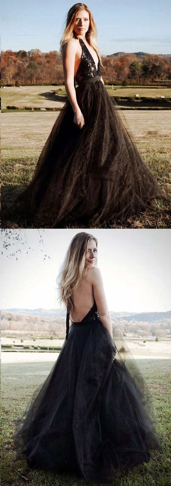 • Black Tulle Backless Halter A Line Cheap Long Prom Dress Sexy Evening Dresses OKG27