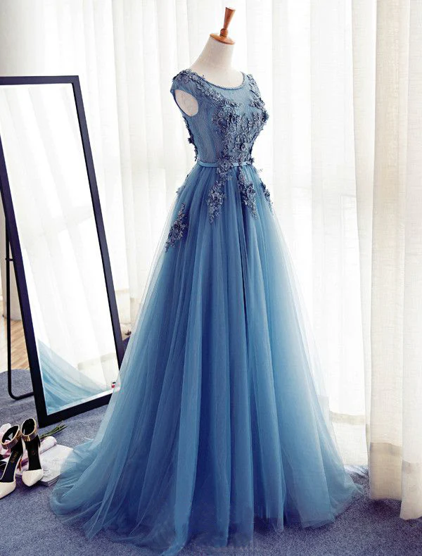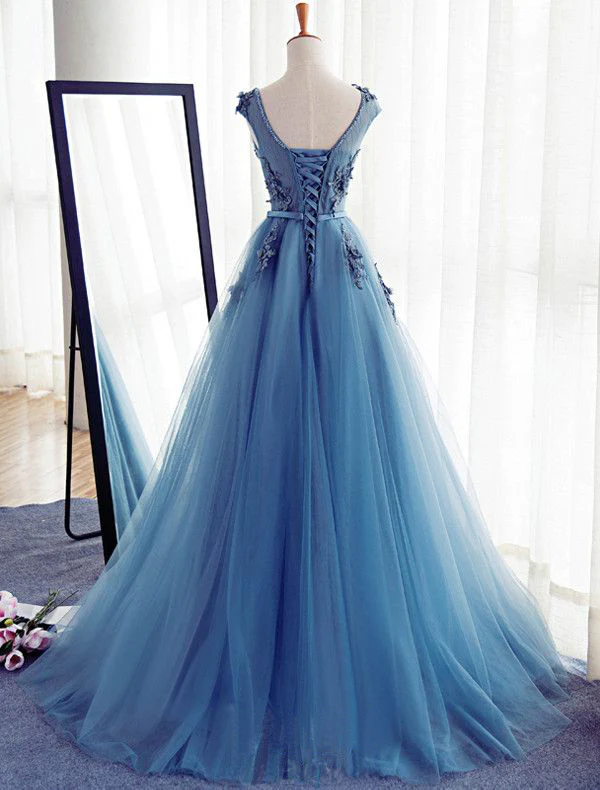 Charming Long Tulle Handmade A Line Blue Prom Gowns,Best Formal Women Dresses OK243