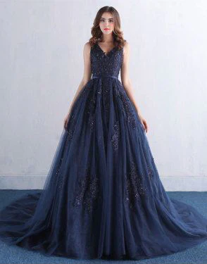 Dark Blue V Neck A Line Appliques Tulle Long Prom Dresses OK820
