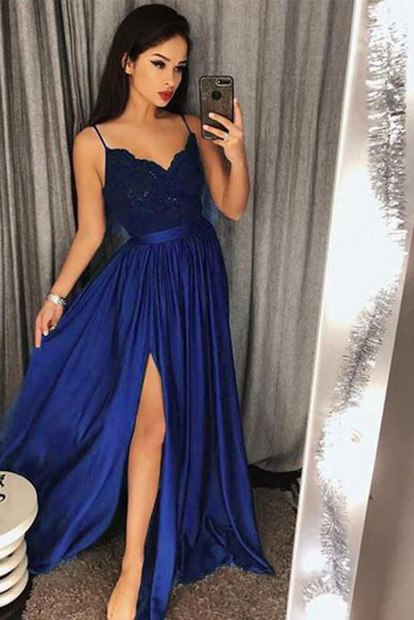 Dark Green Spaghetti Straps Split Lace Long Prom Dresses OK949