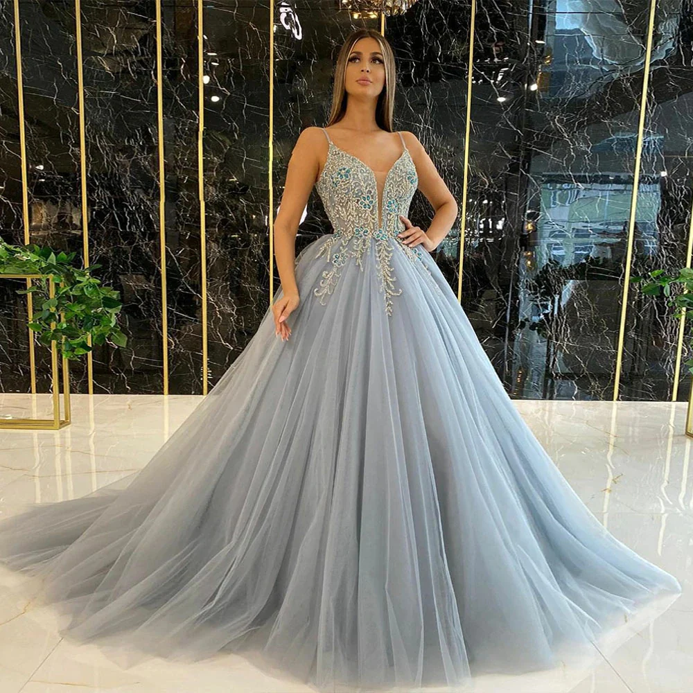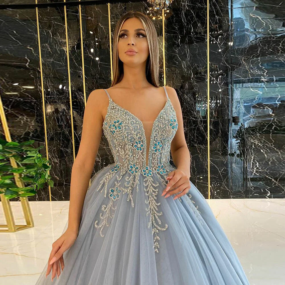 Dusty Blue Ball Gown Prom Dress Long Spaghetti Straps Tulle Crystals Beaded Formal Party Dress OKV97