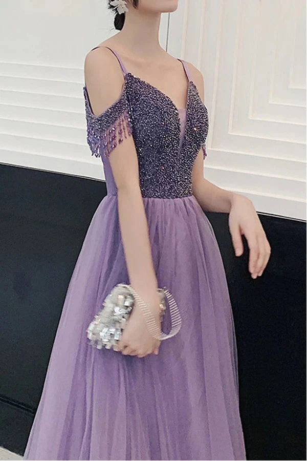 Elegant Cold Shoulder Beaded Lilac Tulle Long Prom Dress OKT95