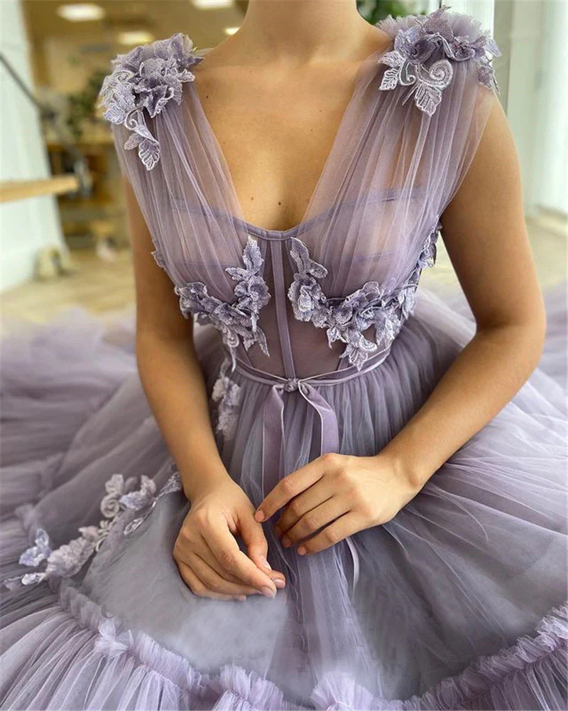 • Elegant Tulle A-line Long Prom Dress Sheer V Neck 3D Flowers Evening Gowns OKV54