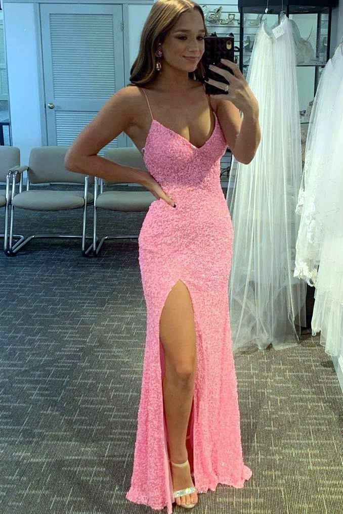 • Flattering Mermaid Hot Pink Sequins Long Prom Party Dress With Slit OK1309