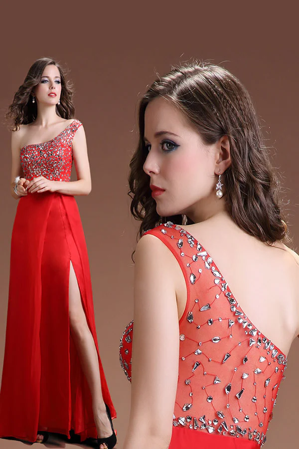 One Shoulder Red Beaded Open Back Prom Dress with Split ED0834