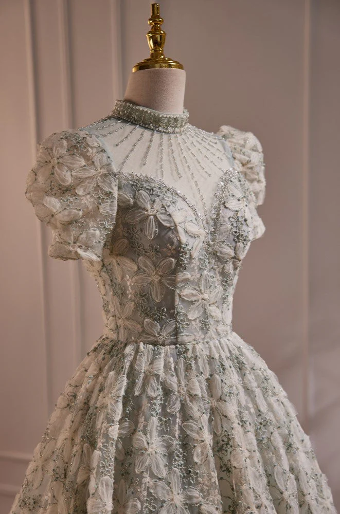 This stunning prom dress features intricate beadwork and delicate floral appliques on the elegant short sleeves. Crafted with luxurious fabric, it exudes grace and charm. Make a statement and stand out at your prom with this gorgeous and sophisticated dress.