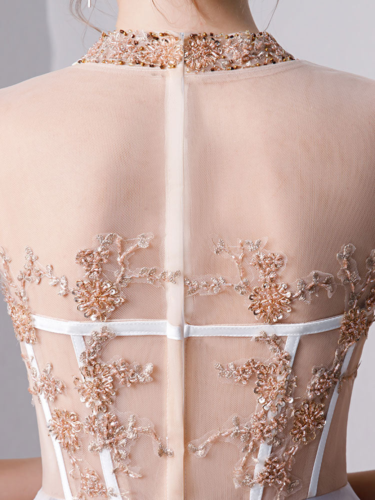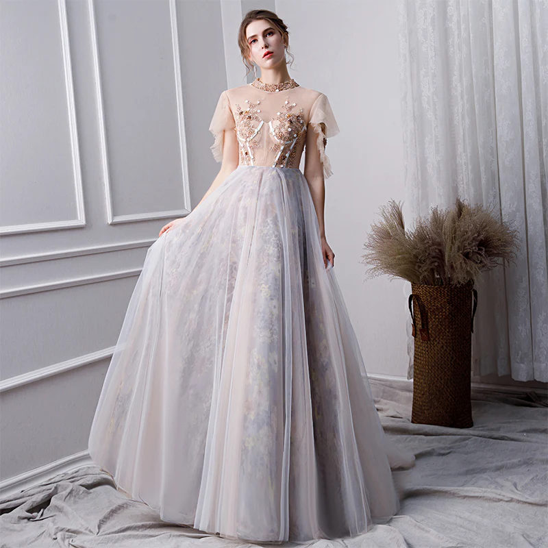 Gray A Line High Neck Short Sleeves Prom Dress With Beads OKL26