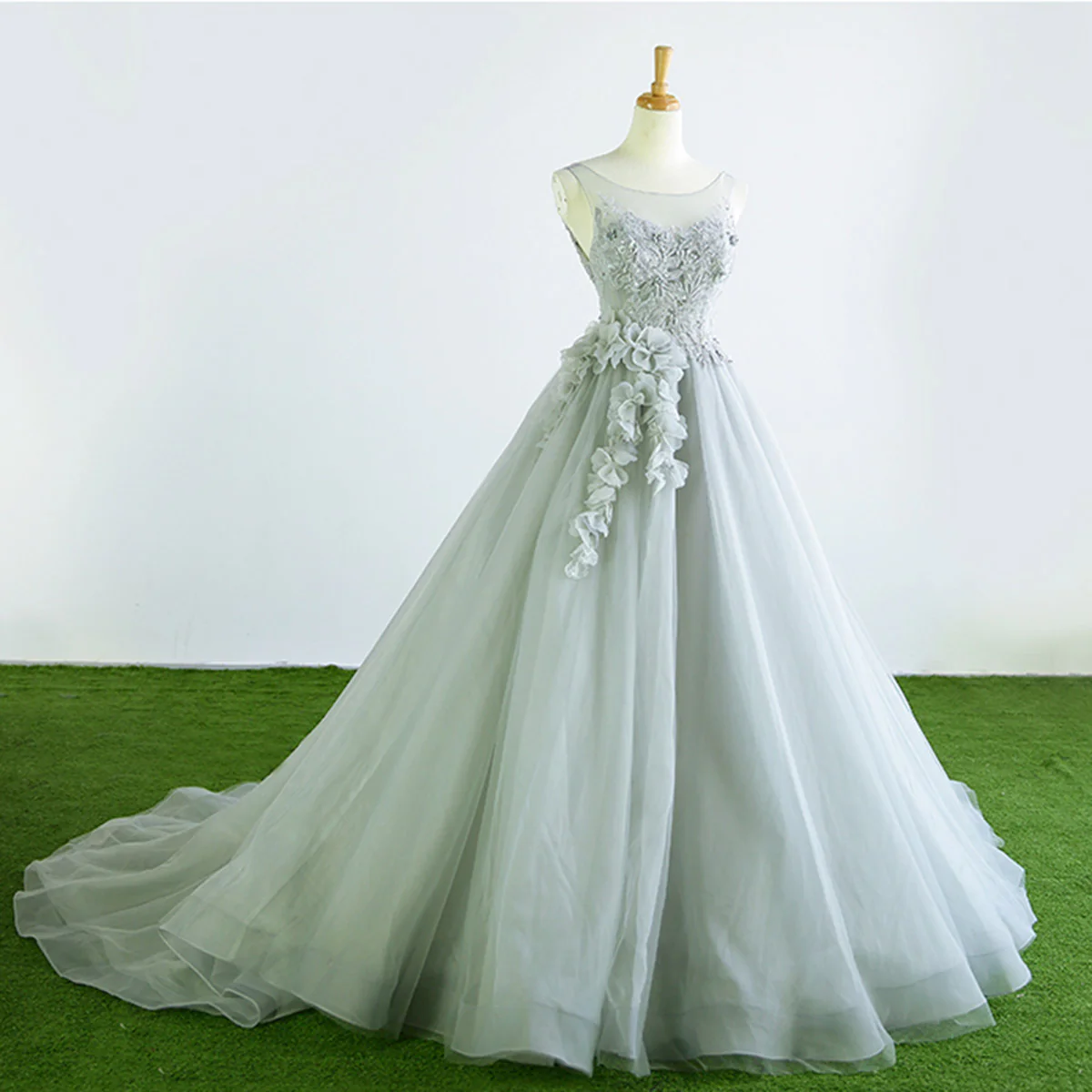 Gray Tulle Court Train Formal Long Prom Dresses With Flowers OK942