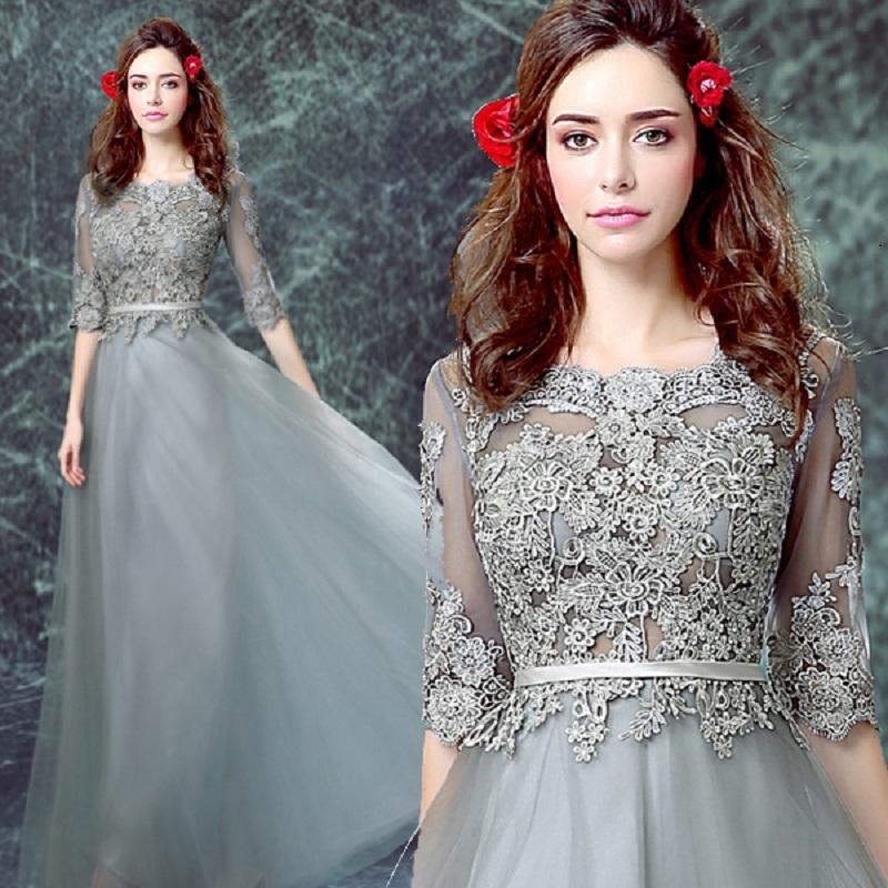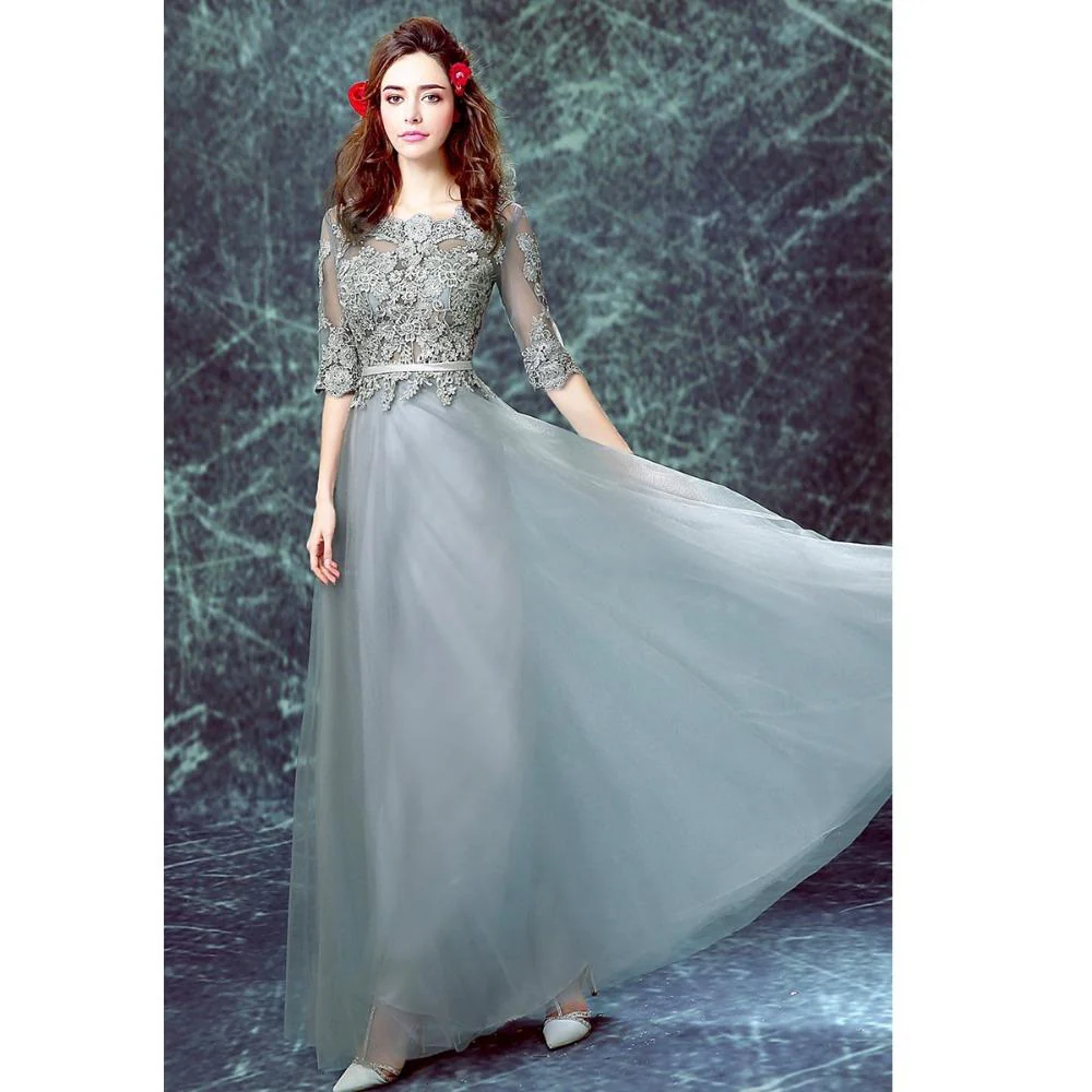 Grey Floor-length Half Sleeve Tulle Long Prom Dresses,A line Evening Dress OK882