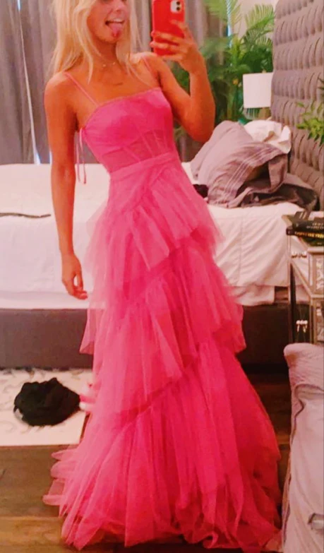 Hot Pink A Line Ruffles Tulle Prom Dress Long Evening Party Gowns OK1609