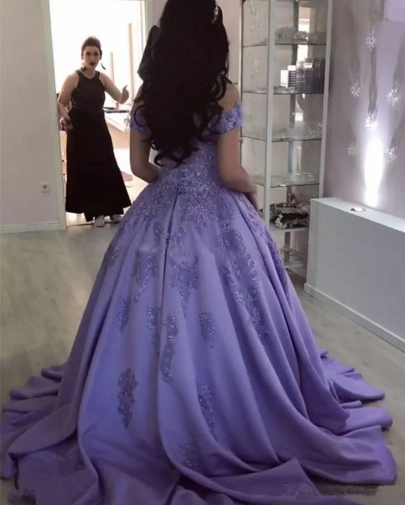 Lavender Ball Gown Off the Shoulder Lace Appliques Prom Dress OKJ66