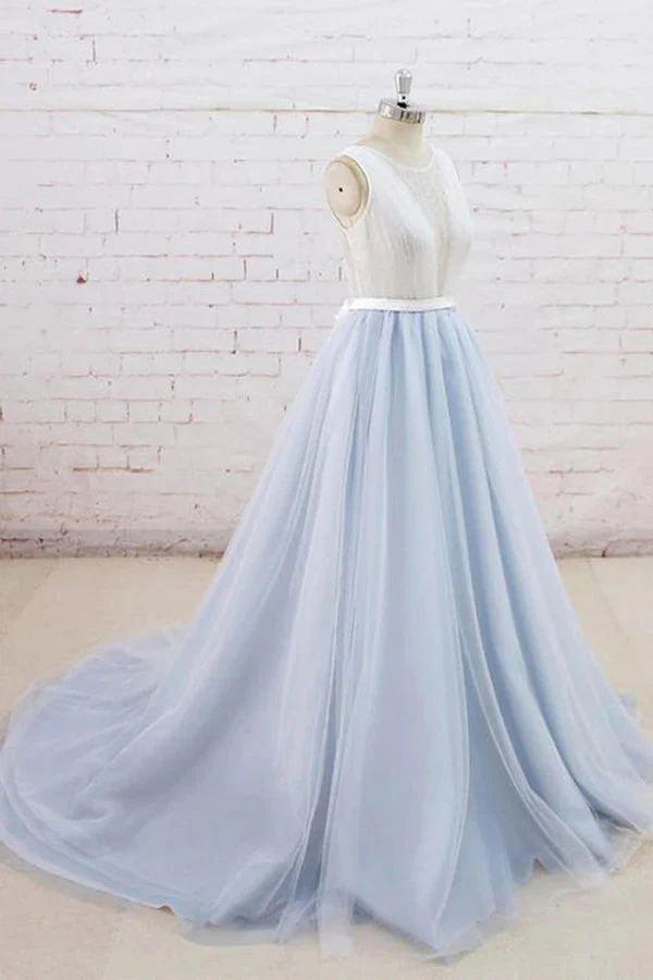 Light Blue Tulle Sheer Back A-line Round Neck Formal Prom Dress OKU11