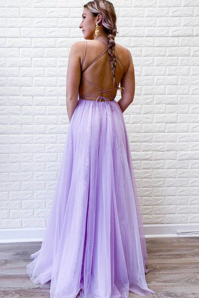 • Lilac Purple A-Line Tulle Lace Appliques Long Prom Dress Evening Dress OK1224