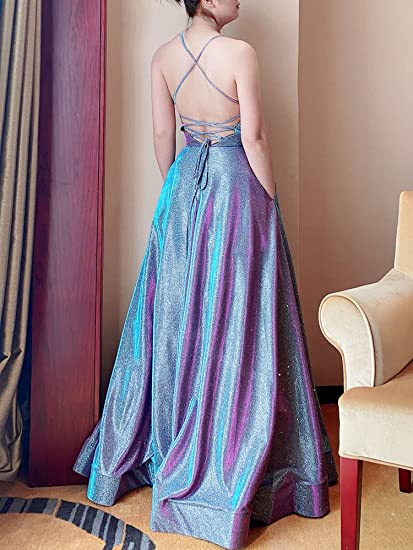 Long A-line Prom Dress with Pockets Formal Evening Ball Gowns Side Slit Glitter Party Dress OKY42