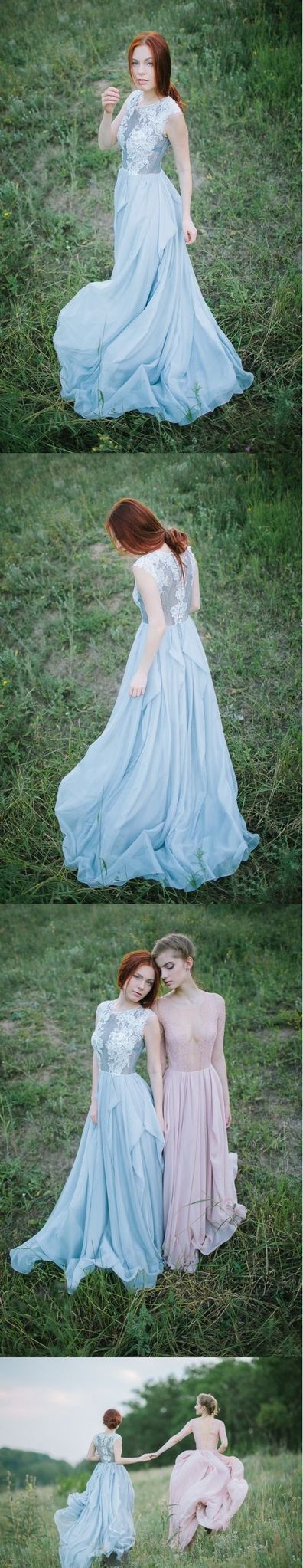 • Long Light Blue Chiffon Scoop A-line Floor-length Appliques Prom Dresses OK736