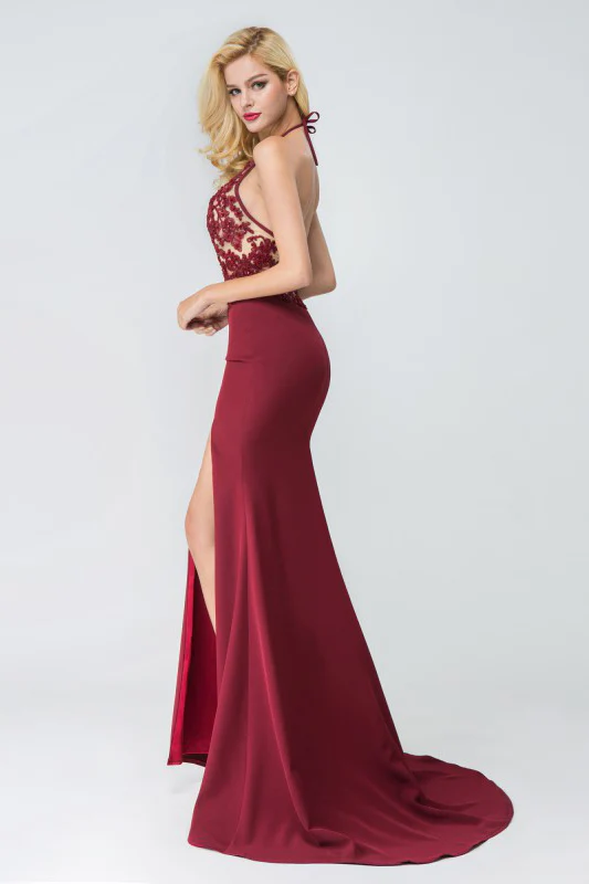 • Mermaid Halter Sleeveless Burgundy Long Split Prom Dress,Evening Dresses OKA68