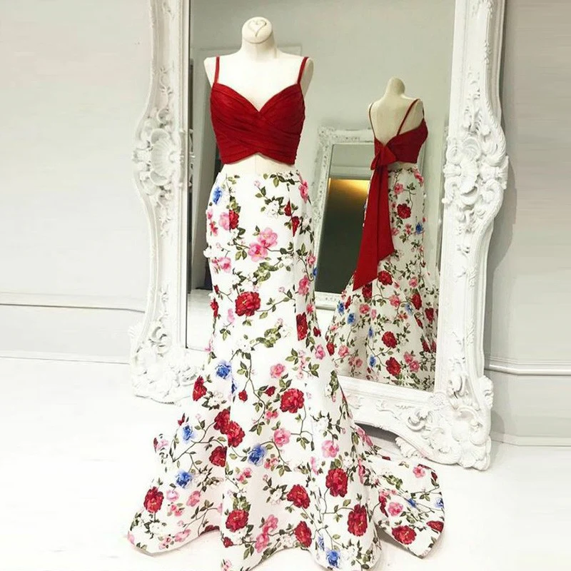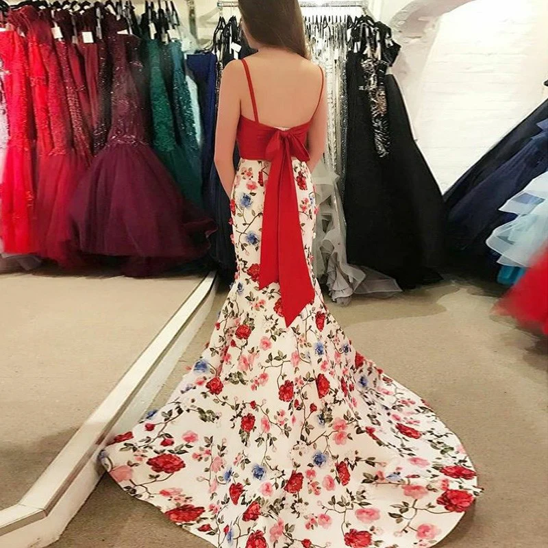 Mermaid Spaghetti Straps Floral Print Red Top Prom Dress OKI84