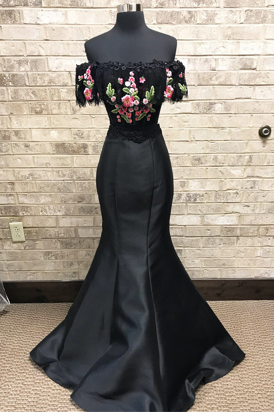 Mermaid Two Piece Embroidery Black Long Prom Dresses OKL6