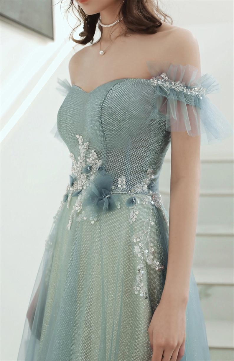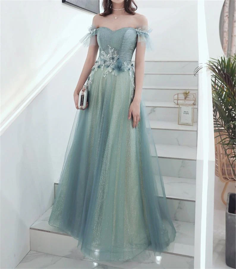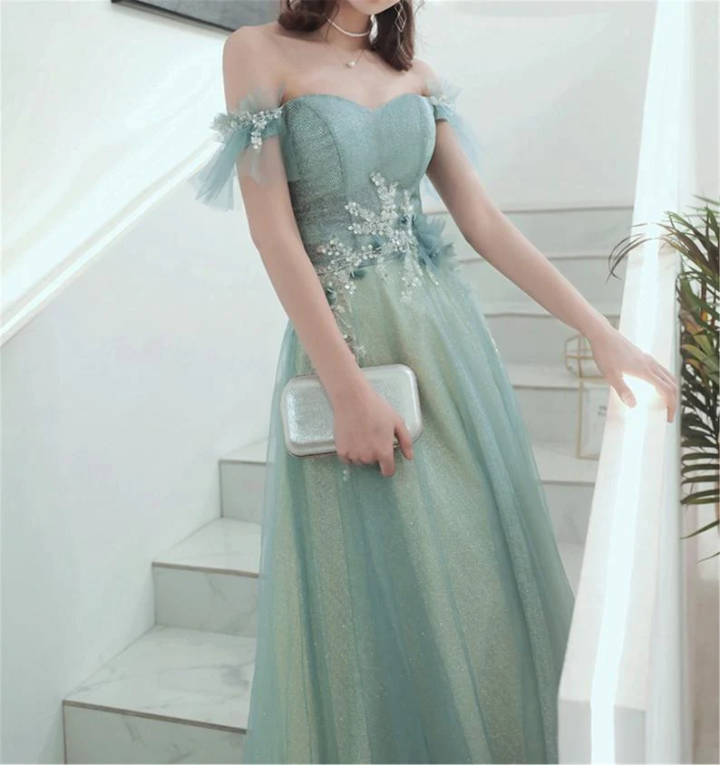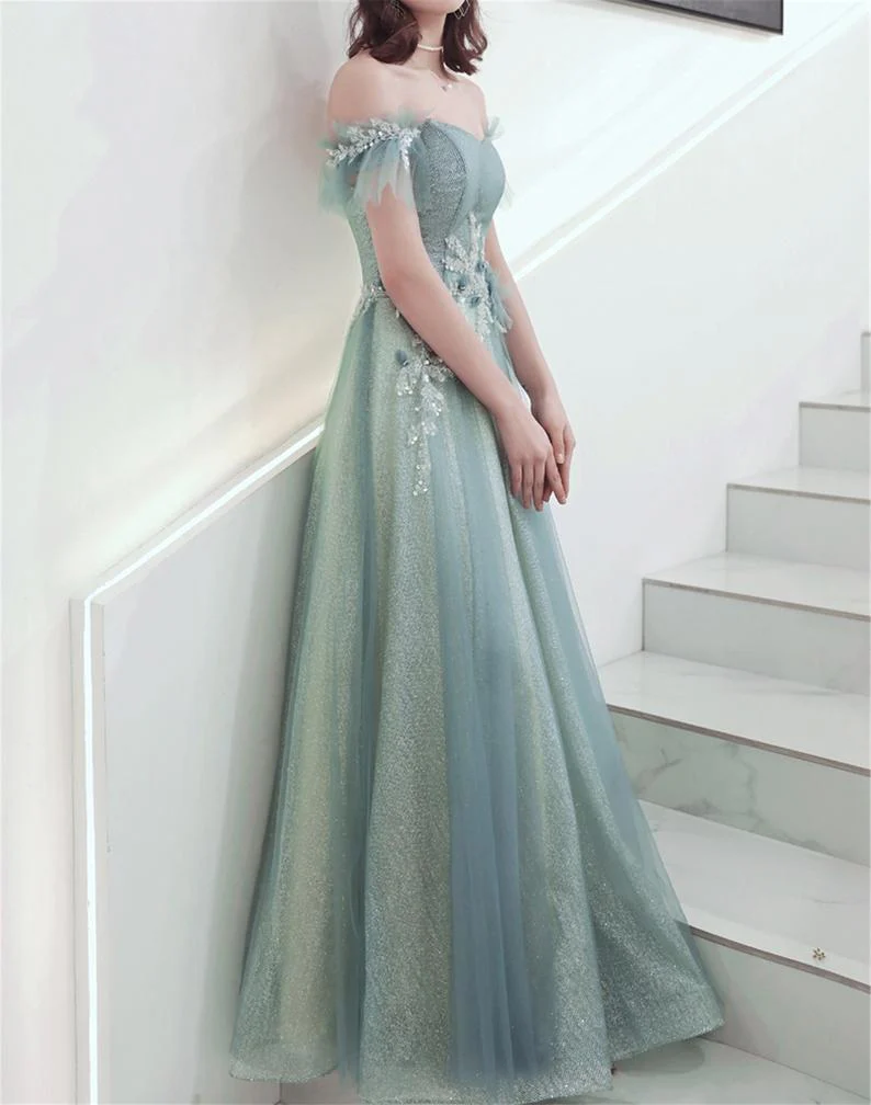 • Mint Green Off Shoulder Appliques Long Prom Dress Evening Dress Women Custom Dress OKV88