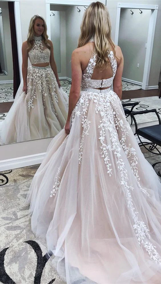 New A Line Two Pieces High Neckline Long Lace Formal Prom Dresses OK732