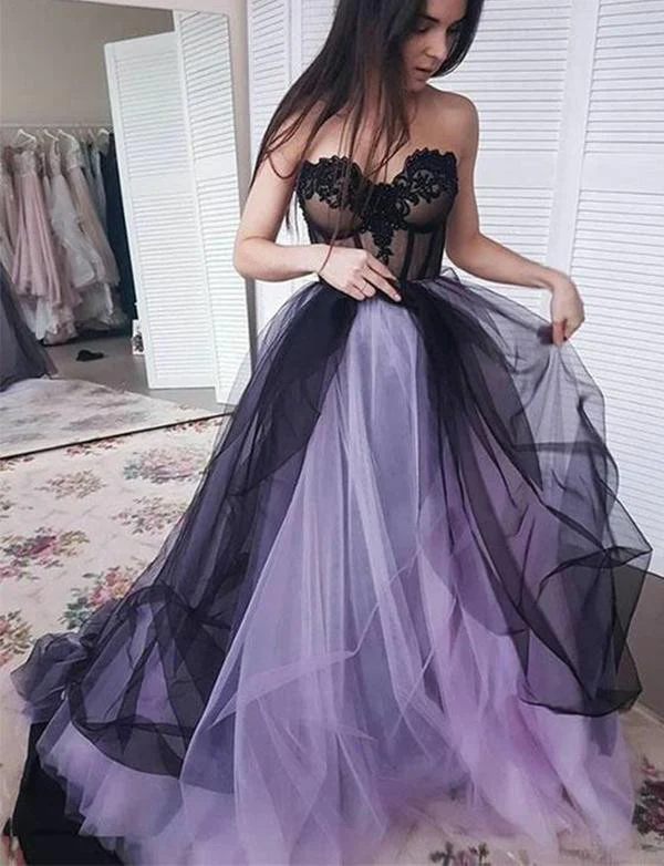 • New Arrival Sweetheart Long Tulle Sleeveless Lilac Black Prom Dresses with Appliques OKH42